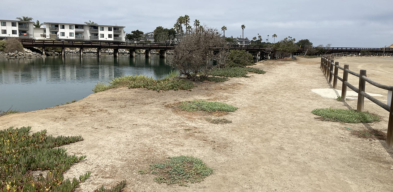 This project will extend public access along the north side of the river between Jimmy Durante Boulevard and the existing railroad bridge in Del Mar along the Fairgrounds as a new segment of Coast to Crest Trail. A 25-foot-wide Recreational Buffer was set aside several years ago but never improved for safe public access. This project will provide a 1,300-foot fenced path along the river edge, a new accessible connection (ramp) from Jimmy Durante, and a turnaround at the west end near the railroad bridge. This project is a component of the Reach the Beach Trail.