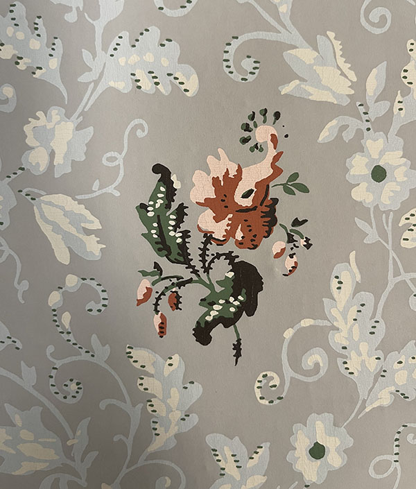 Large sections of each wallpaper pattern were carefully removed during the reconstruction process and carefully preserved. Paint samples were analyzed to determine the composition and age of selected layers. The blue/rose flower pattern was selected to be reproduced and installed on the same walls in the manner found.